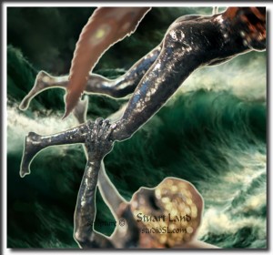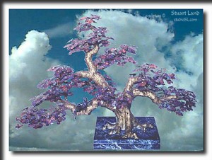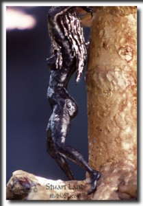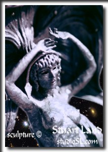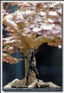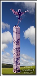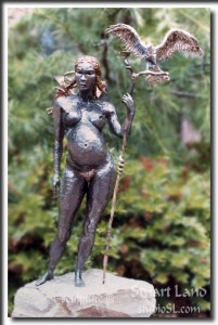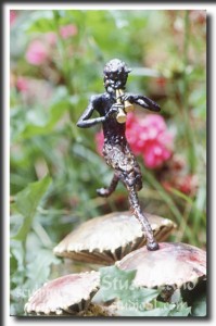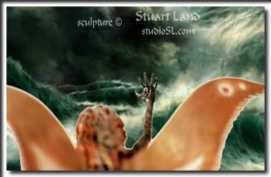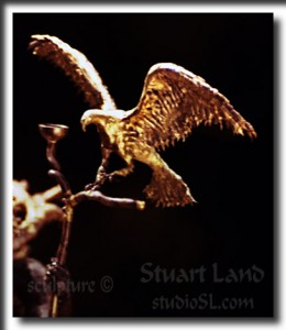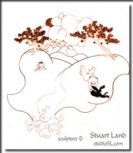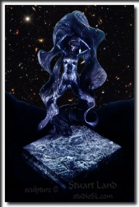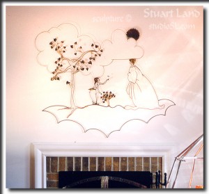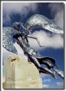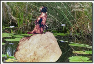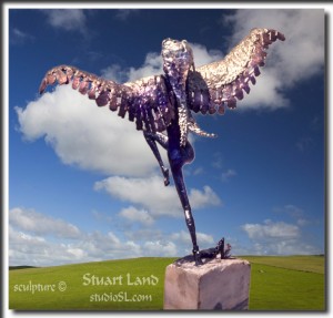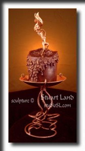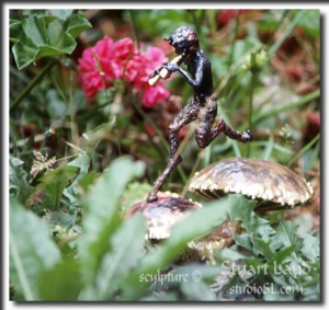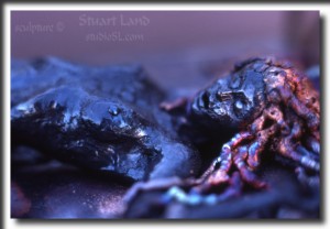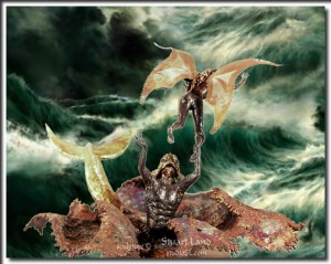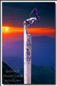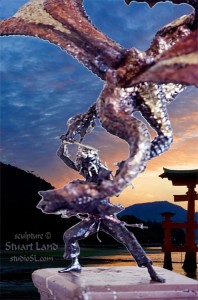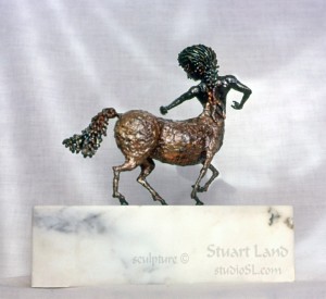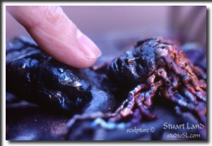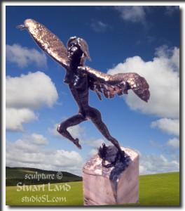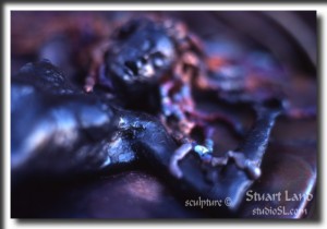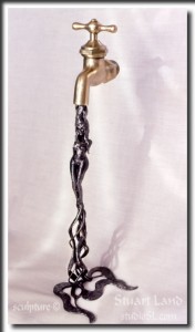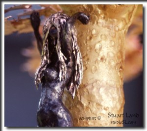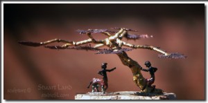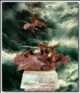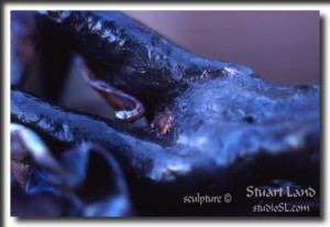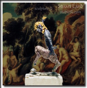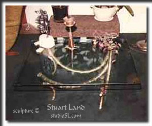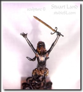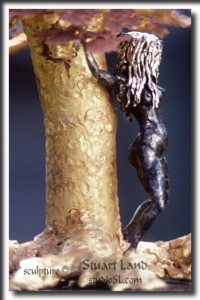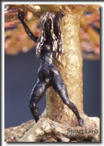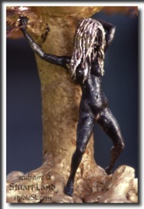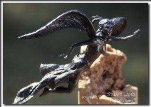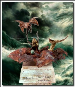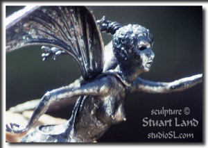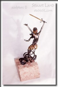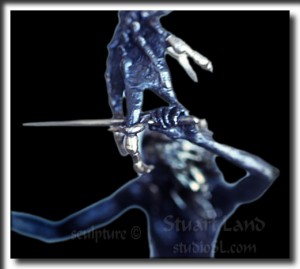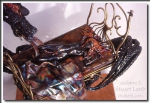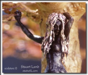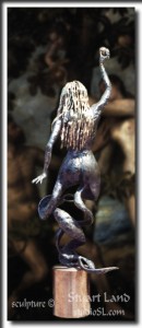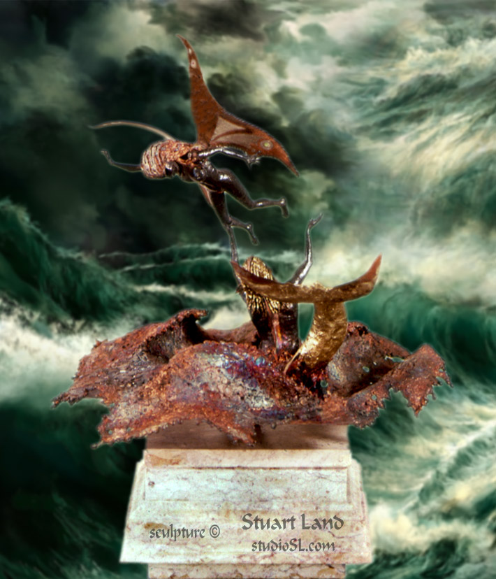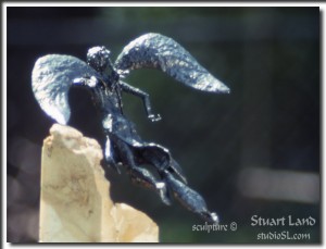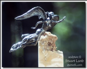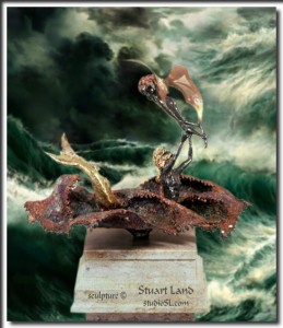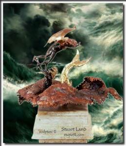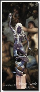 Another couple of years passed before I could make the female form anywhere close to what I had envisioned. This was because I didn’t know anything about anatomy, art or style. I learned all of that at the same time I was perfecting my techniques. The figures in the playful scene are 1/11th scale, or around 6 inches. Their bodies are steel. Her wings are copper with inlaid silver and semi-precious stones. His hair and tail are bronze. The sea is copper on a marble base.
