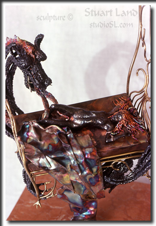 Playful erotic fantasy. The dragon is made of steel with a copper crest and nickle-silver claws. The 6 inch woman is steel, with copper hair. The bed is copper and bronze, on a red marble base.