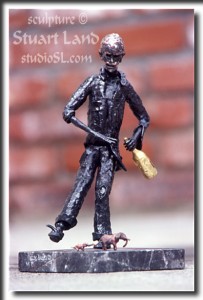 The tools of a metal sculptor are an oxyacetylene welding setup (a welding torch connected by hoses to a gas-flow regulator attached to Oxygen and Acetylene tanks), and hand tools, like pliers, hammers, saws, metal cutters, etc. Some metal sculptors use electric or air powered machinery, but I chose to remain simple and hardly ever used grinders or presses.