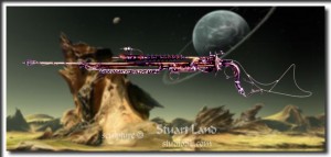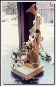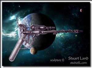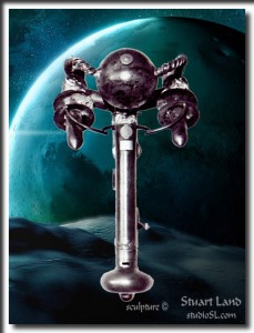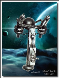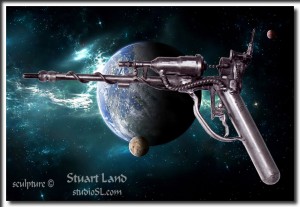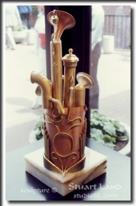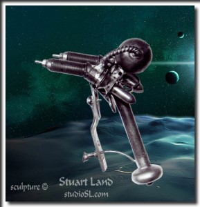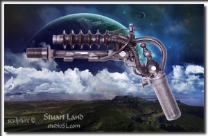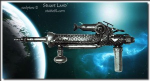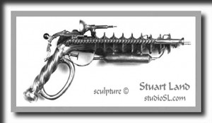 These ray guns were sculpted from found objects made of copper, brass, steel, nickle-silver, and other alloys. They’re very much influenced by the halcyon days of early Buck Rogers and other sci-fi magazines and movies.