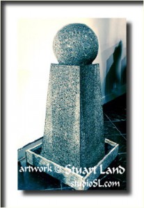 These full-size, floor-standing, rotating sphere water fountains are made from granite or marble. The 16 inch spheres weigh 200 lbs each. The bases weigh up to a 1000 lbs or more. All of them disappeared when Jurassic, Inc., in Santa Monica, California, suddenly closed its doors around 2006. If anyone has any information about any of these fountains, please contact me.